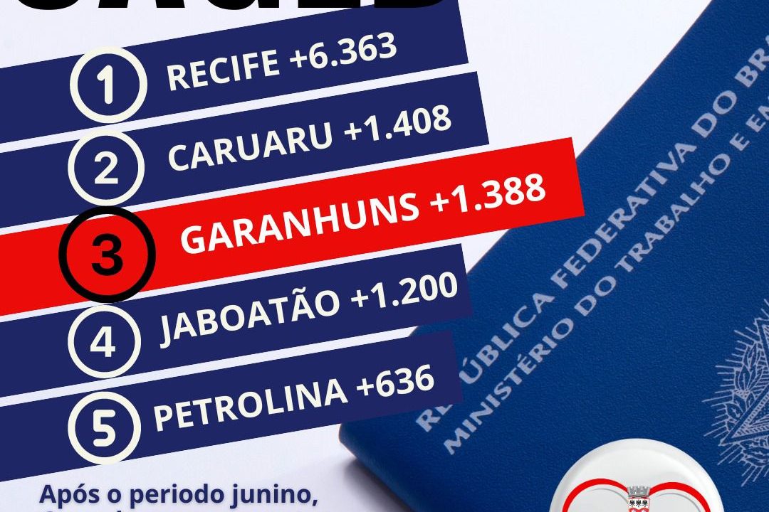 Garanhuns contabiliza resultado positivo de 109 novos empregados, saldo das 686 admissões e 577 desligamentos. No acumulado do ano, Garanhuns apresenta 1.388 novos postos de trabalho, apenas 20 empregos a menos que Caruaru, que viveu um período junino intenso de quase 70 dias. Vale ressaltar ainda que Garanhuns possui menos da metade da população da Capital do Forró, no entanto, tem sido equivalente na geração de empregos com carteira assinada, e está na frente de outros grandes municípios, a exemplo de Jaboatão, Olinda, Cabo de Santo Agostinho e Petrolina.