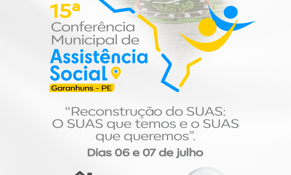O Conselho Municipal de Assistência Social (Cmas), realiza nos dias 06 e 07 de julho a 15ª Conferência Municipal de Assistência Social. Com o tema: “Reconstrução do SUAS: O SUAS que temos e o SUAS que queremos”, o evento conta com a parceria da Prefeitura de Garanhuns, através da Secretaria de Assistência Social e Direitos Humanos e será realizado no auditório do Sesc, a partir das 8h.