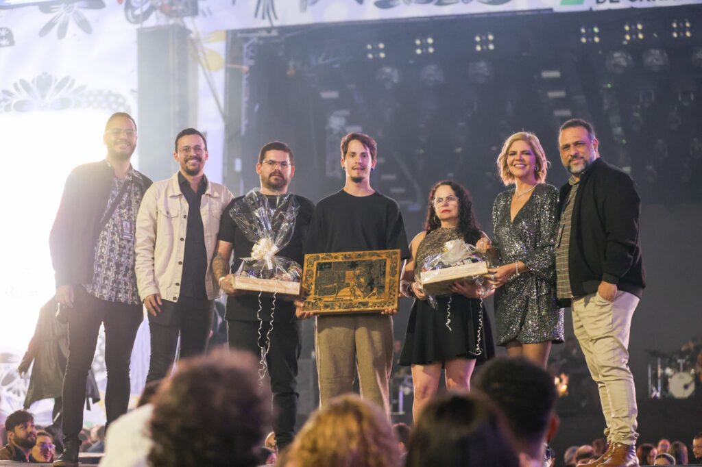 A noite de sábado (26) também foi marcada pela homenagem à J. Borges. O homenageado do 33º FIG, que completou um ano de falecimento, foi lembrado com afeição em meio ao último final de semana do Festival. A secretária de Cultura de Garanhuns, Sandra Albino, realizou a entrega de uma placa em madeira feita pelo garanhuense Gedilson Soares para a família do mestre: Bacaro Borges, filho e idealizador da identidade visual do 33º FIG, Carlos Borges, filho e Nena Borges, esposa.