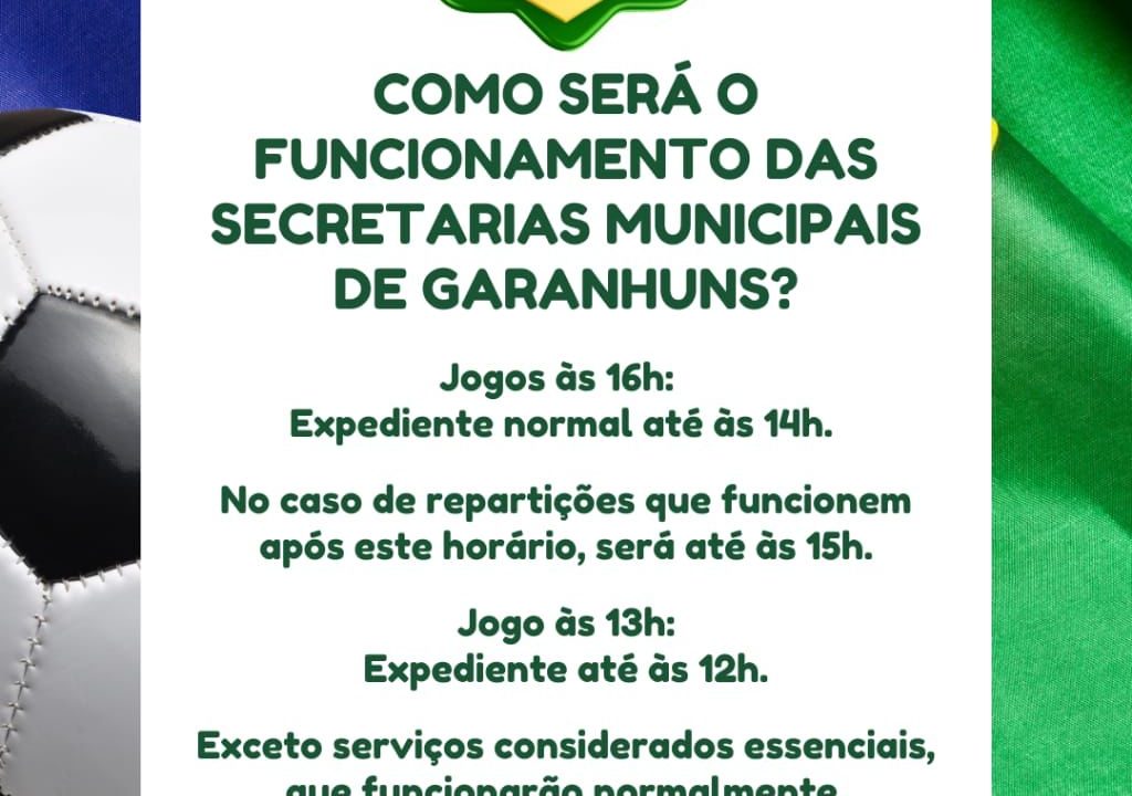 Começou a Copa do Mundo no Catar, e o Brasil vai com tudo buscar o Hexa!! Para que o funcionalismo municipal possa assistir aos jogos da Seleção Canarinha, a Prefeitura de Garanhuns está publicando decreto que regulamenta o horário de funcionamento das repartições públicas do município.