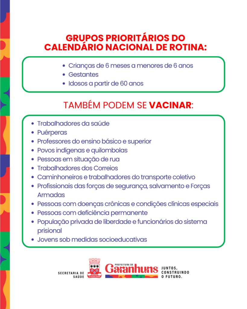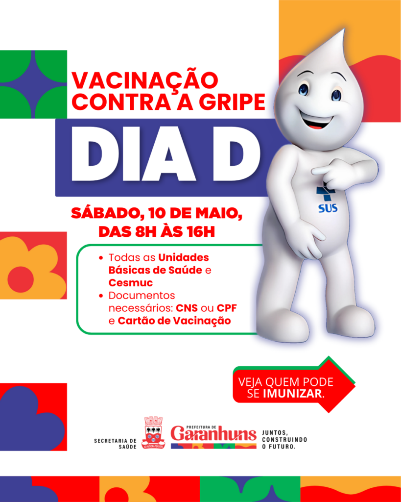 Neste sábado (10), Garanhuns realiza o dia D de vacinação contra a gripe. A mobilização vai atender os grupos prioritários, incluindo crianças de 6 meses a menores de 6 anos, idosos e gestantes e ocorrerá nas Unidades Básicas de Saúde (UBSs) e no Centro de Especialidades da Saúde da Mulher e da Criança (Cesmuc), das 8h às 16h.