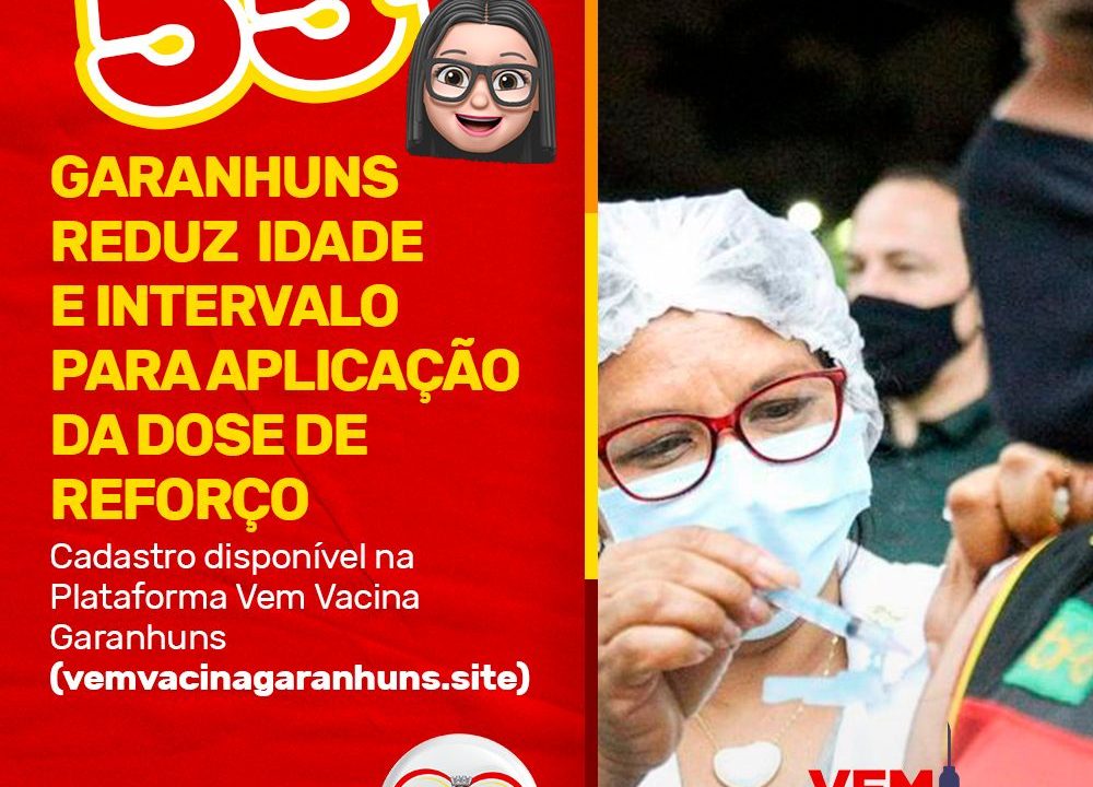 A Prefeitura de Garanhuns vai reduzir a faixa etária para aplicação da dose de reforço. Já podem se vacinar as pessoas com 55 anos de idade ou mais que completaram o esquema vacinal há pelo menos quatro meses. Assim, o município também passa a adotar o intervalo de 120 dias, após o encerramento do esquema vacinal, para aplicação da dose de reforço.
