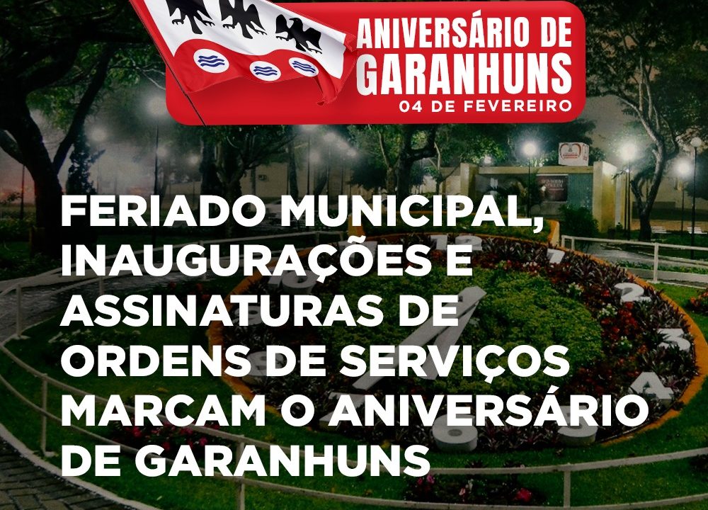 A Prefeitura Municipal de Garanhuns, informa que no próximo sábado (04/02), dia em que se comemora a elevação do município à categoria de cidade, será feriado, conforme Lei nº 4.752/2021.