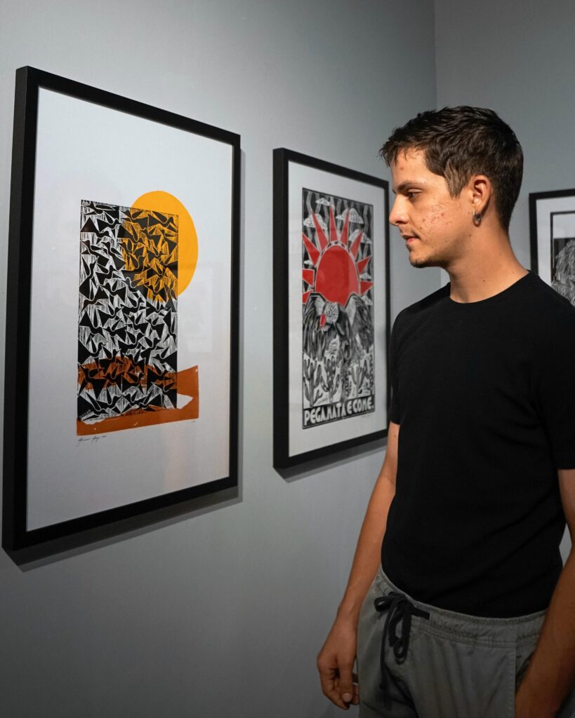 Com 25 anos, Bacaro Borges carrega desde a infância a influência do pai. Produziu sua primeira xilogravura aos quatro anos e hoje possui uma produção artística marcada pela riqueza de detalhes e por temas que abordam a realidade social do povo nordestino. Apesar de seguir a mesma técnica, Bacaro desenvolveu um estilo próprio, contemporâneo e sensível, que vem ganhando espaço em murais, exposições e projetos gráficos em todo o país.