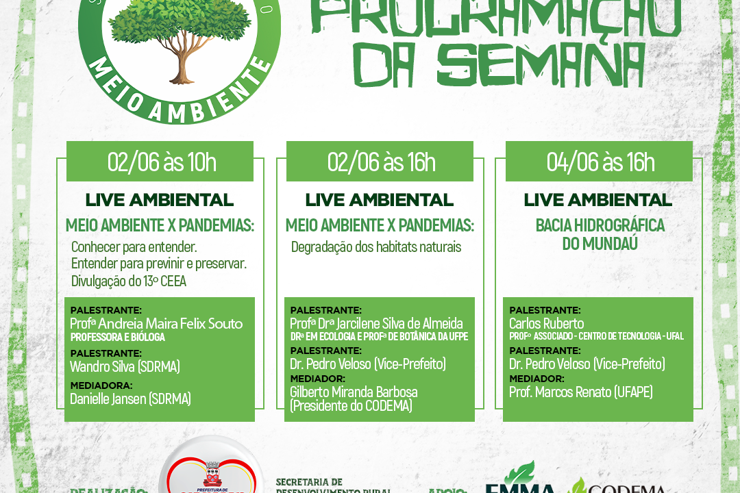 As lives acontecerão nos dias 02 e 04 de junho, às 10h e 16h respectivamente. Dentre os convidados, a professora Andreia Felix, que abordará o tema “Meio Ambiente x Pandemias”; o vice-prefeito, Dr. Pedro Veloso e a Drª Jarcilene Silva, que falarão sobre a degradação dos habitats naturais. Os professores Carlos Ruberto – UFAL e Marcos Renato – UFAPE, abordarão a bacia hidrográfica do Mundaú. A Secretária Interina da pasta, Pâmela Rodrigues, também participa do momento.