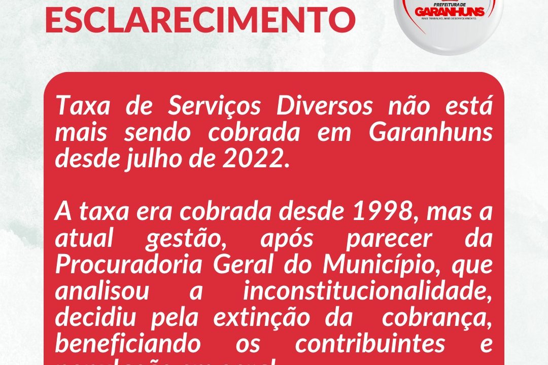 A Prefeitura de Garanhuns, através da Secretaria de Finanças, vem a público esclarecer que desde julho de 2022 a Taxa de Serviços Diversos (TSD) não tem sido cobrada no município.