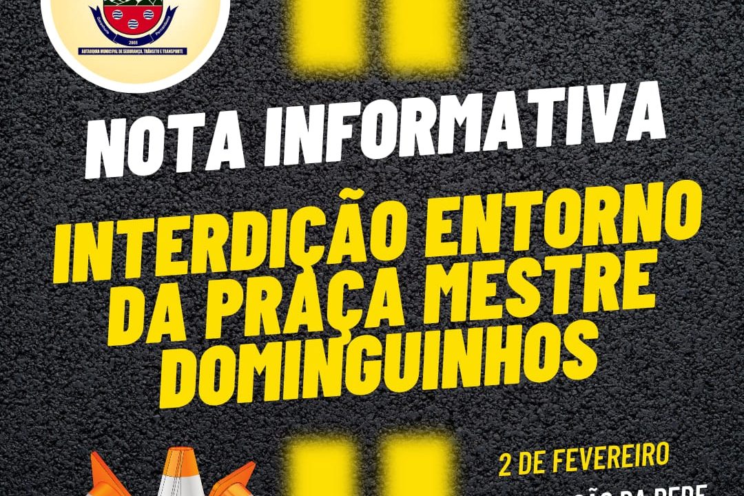 A Autarquia Municipal de Segurança, Trânsito e Transporte – AMSTT, informa aos condutores de automóveis e população em geral, que em decorrência das chuvas que caíram na tarde dessa quinta-feira (02), provocando o estouro de uma rede de águas pluviais que passa na Praça Mestre Dominguinhos, fazendo com que o solo próximo as escadarias cedesse, houve a necessidade de interditar o entorno do local por recomendação da Defesa Civil.
