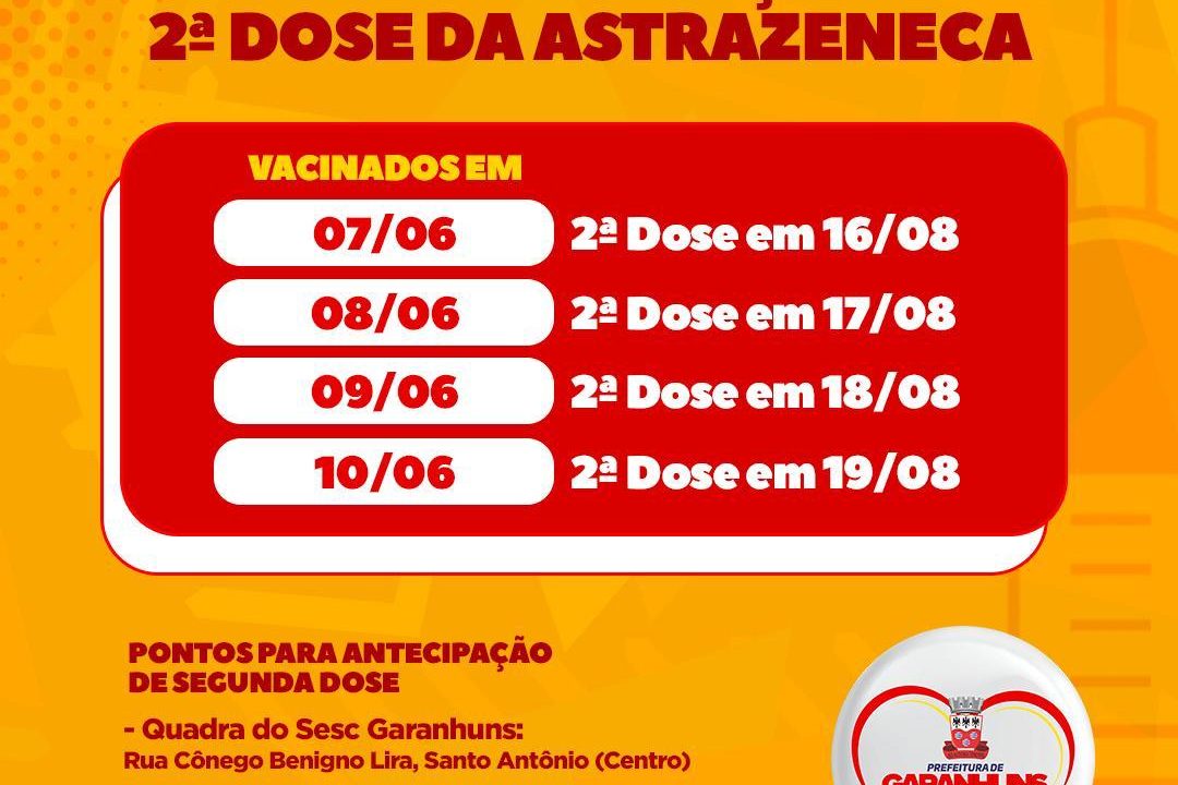 A Secretaria de Saúde divulga o calendário atualizado de antecipação da segunda dose das vacinas Astrazeneca, para pessoas que foram vacinadas com a primeira dose em Garanhuns, no período de 07 a 10 de junho.
