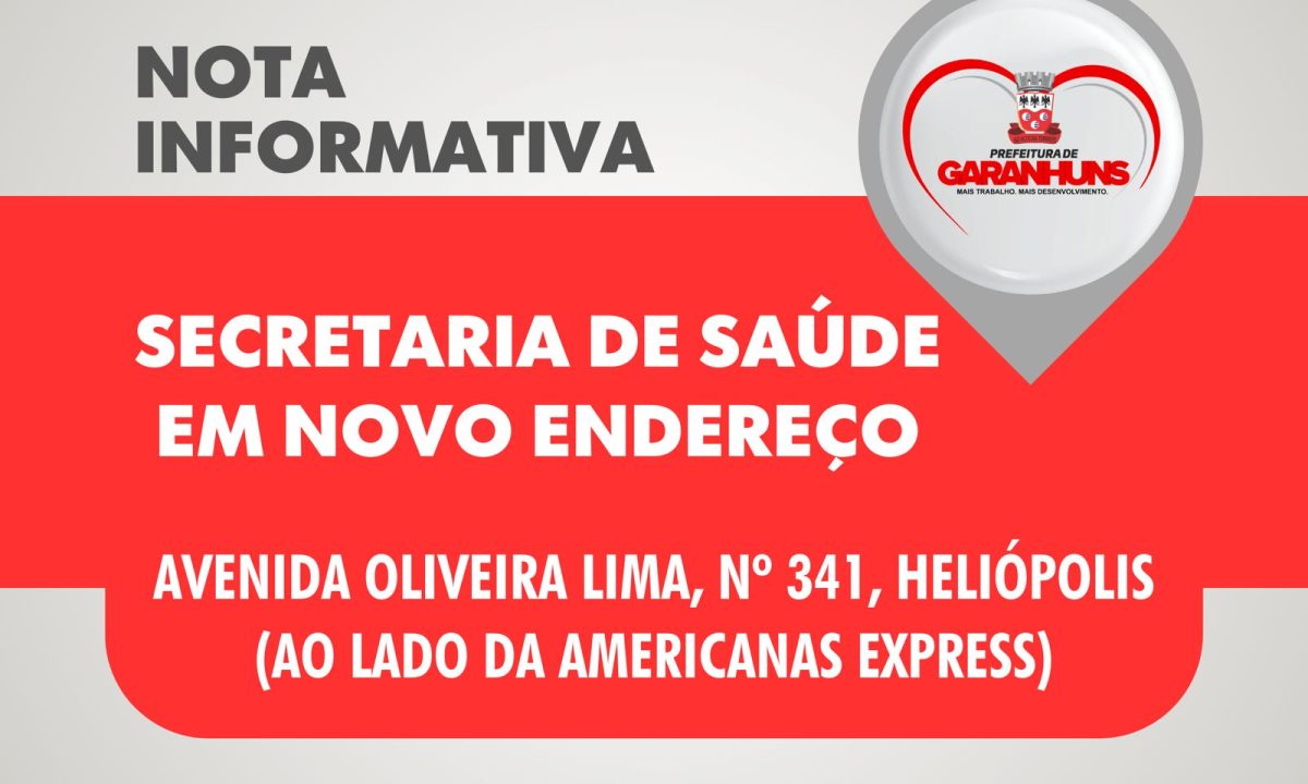 A Secretaria de Saúde de Garanhuns informa sobre a mudança de todos os setores ligados à pasta, e que antes funcionavam no Centro Administrativo I, na rua Joaquim Távora, s/n°, próximo à Câmara de Vereadores. Agora o atendimento ao público está centralizado na avenida Oliveira Lima, nº 341, no bairro Heliópolis (ao lado da Americanas Express). O horário de funcionamento é de 08h às 16h.