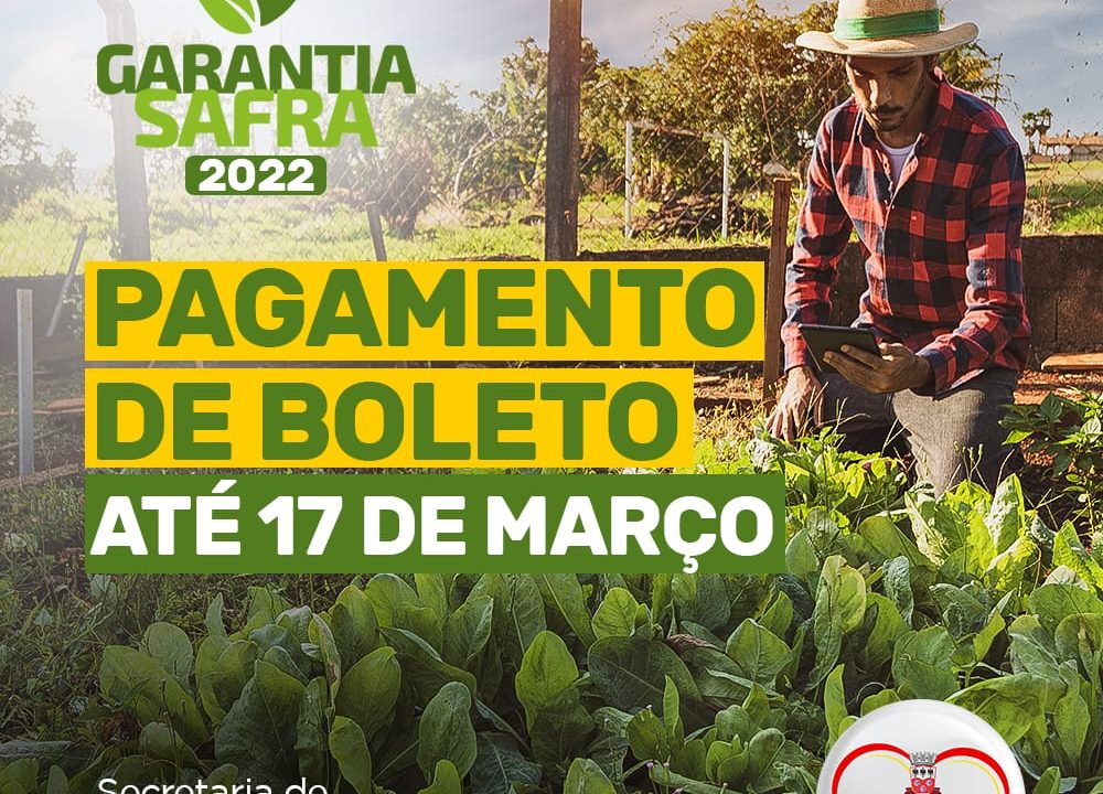 A Secretaria de Desenvolvimento Rural e Meio Ambiente (SDRMA), informa que foi prorrogado o prazo para pagamento do boleto do garantia-safra 2022, a nova data limite passa agora a ser 17 de março. A pasta destaca ainda, que mesmo que o boleto conste a data de 28 de fevereiro, poderá ser pago sem nenhum impedimento.