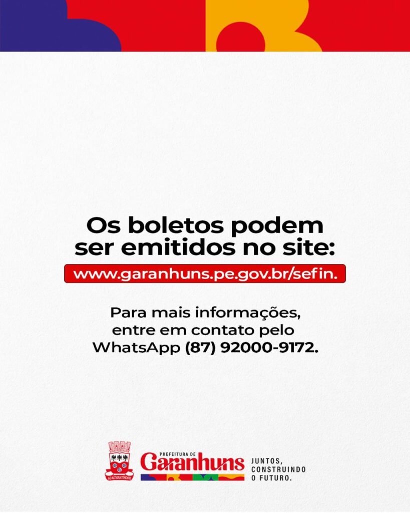A Sefin também informa que o pagamento pode ser parcelado em até 4 vezes, respeitando o valor mínimo de R$ 200,00 por parcela, com os seguintes vencimentos: 1ª parcela ou cota única – 30 de abril; 2ª parcela – 30 de maio; 3ª parcela – 30 de junho; 4ª parcela – 31 de julho. Os boletos já foram entregues nos endereços cadastrados, mas caso o contribuinte não tenha recebido, a guia pode ser emitida no site: www.garanhuns.pe.gov.br/sefin. Para mais informações, entre em contato pelo WhatsApp (87) 92000-9172.