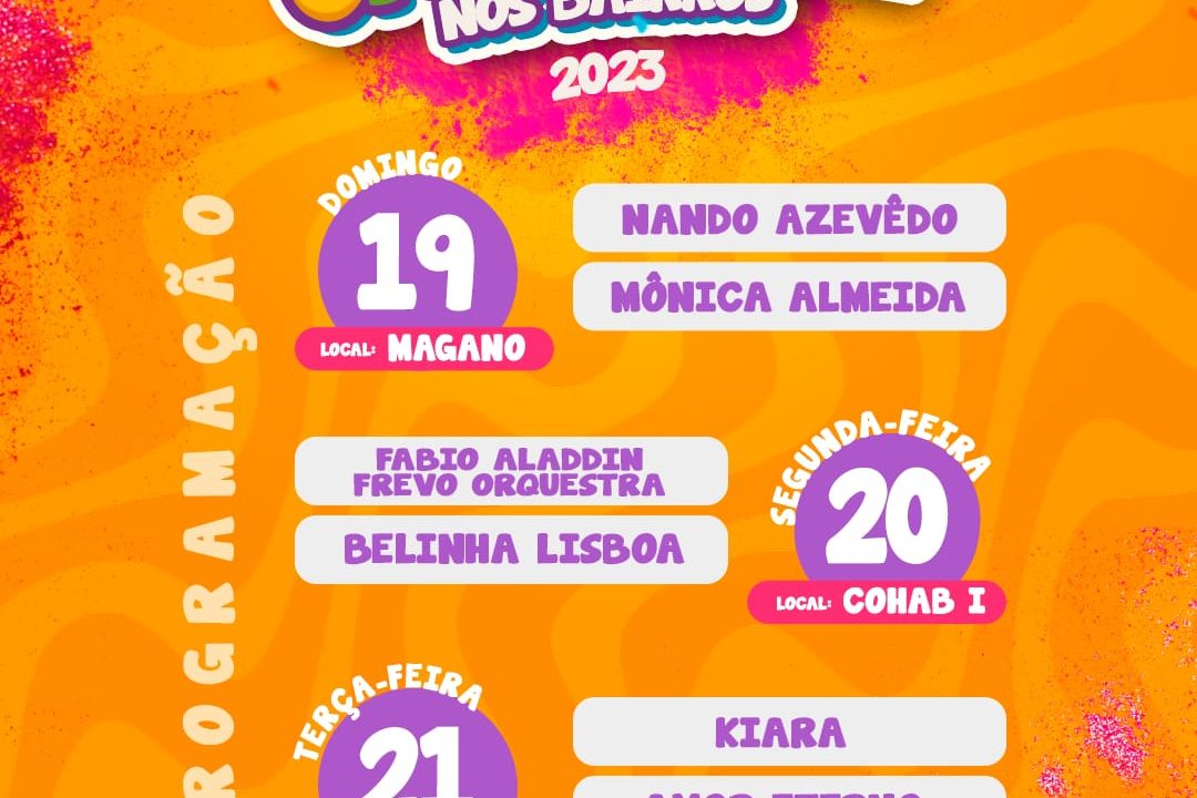Tudo começa no domingo (19), no bairro do Magano, com palco na Avenida Sátiro Ivo, nas proximidades da Rua Santa Terezinha. Os shows serão de Nando Azevêdo e Mônica Almeida. Já na segunda-feira (20) a folia acontece na Cohab I, na Rua Um, próximo ao antigo ponto final, com apresentações de Fabio Aladdin Frevo Orquestra e Belinha Lisboa. Na terça de Carnaval a Boa Vista recebe o evento com seu encerramento. O palco será montado ao lado da Praça Dom Pedro II e os shows ficarão por conta de Kiara e Amor Eterno.