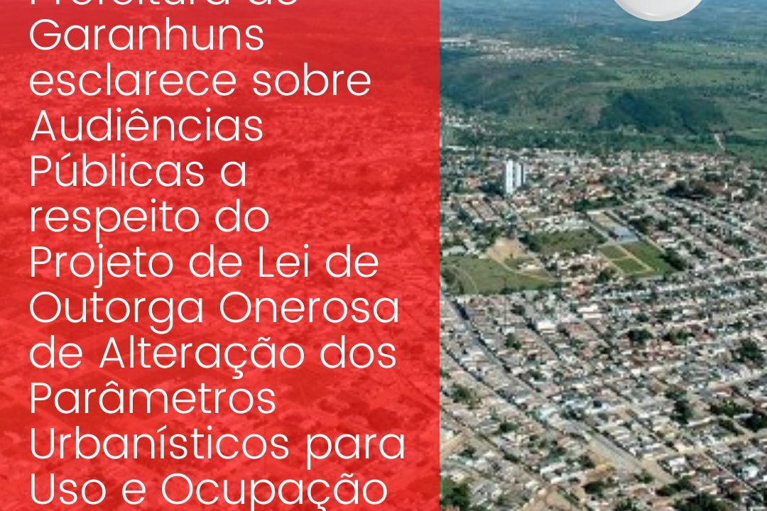 Por meio da Secretaria de Planejamento e Gestão, o município dispõe as informações oficiais sobre o ANTEPROJETO (minuta, uma vez que estamos ouvindo a população para a criação de um projeto), que “dispõe sobre a Outorga Onerosa de Alteração dos Parâmetros Urbanísticos para Uso e Ocupação do Solo – OAPUOS, no Município de Garanhuns e dá outras providências”, que são divulgadas através das redes de comunicação oficiais do município, assim como foram enviados ofícios desde a primeira Audiência Pública, realizada nos dias 09/03/22, 29/03/22 e a próxima no dia 09/05/22, aos órgãos de controle, fiscalização e de conhecimento técnico aprimorado, como alguns dos exemplos como o CAU – Conselho de Arquitetura e Urbanístico, CREA – Conselho Regional de Engenharia, Agronomia e Geociências, MP/PE – Ministério Publico Estadual, OAB – Ordem dos Advogados do Brasil (Subseccional Garanhuns) e outros órgãos que de maneira espontânea colaboraram com ideias e sugestões para o fortalecimento e resgate deste município quem vem sofrendo na ultima década.