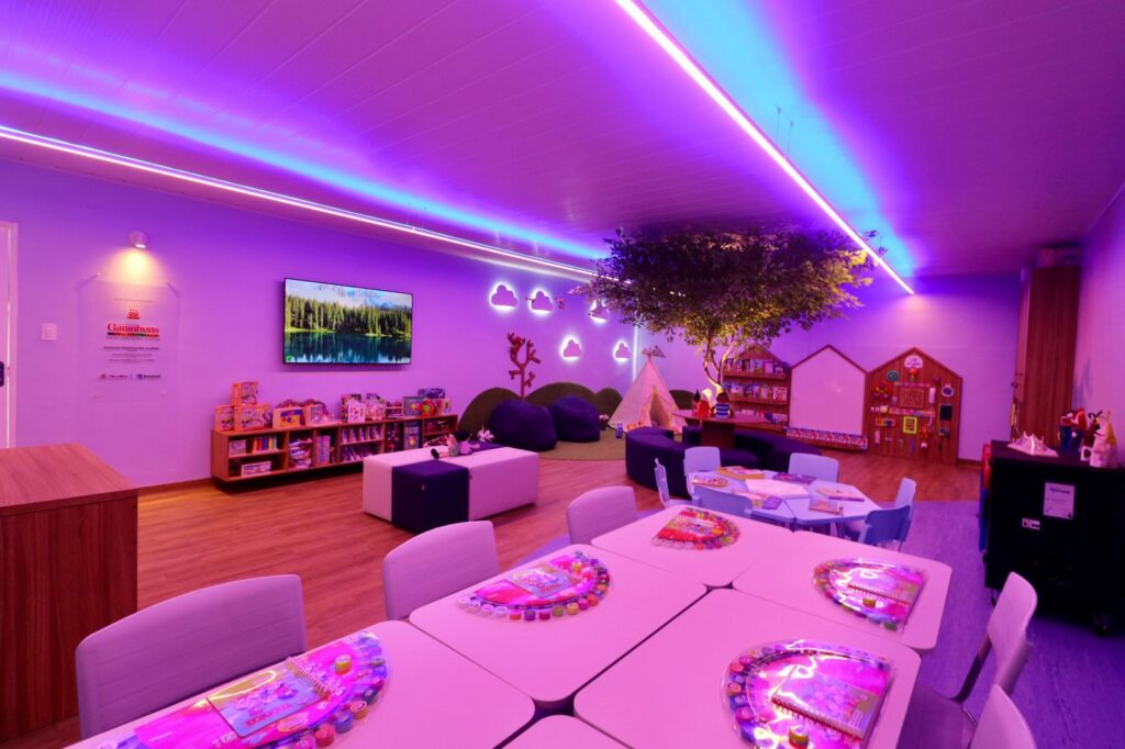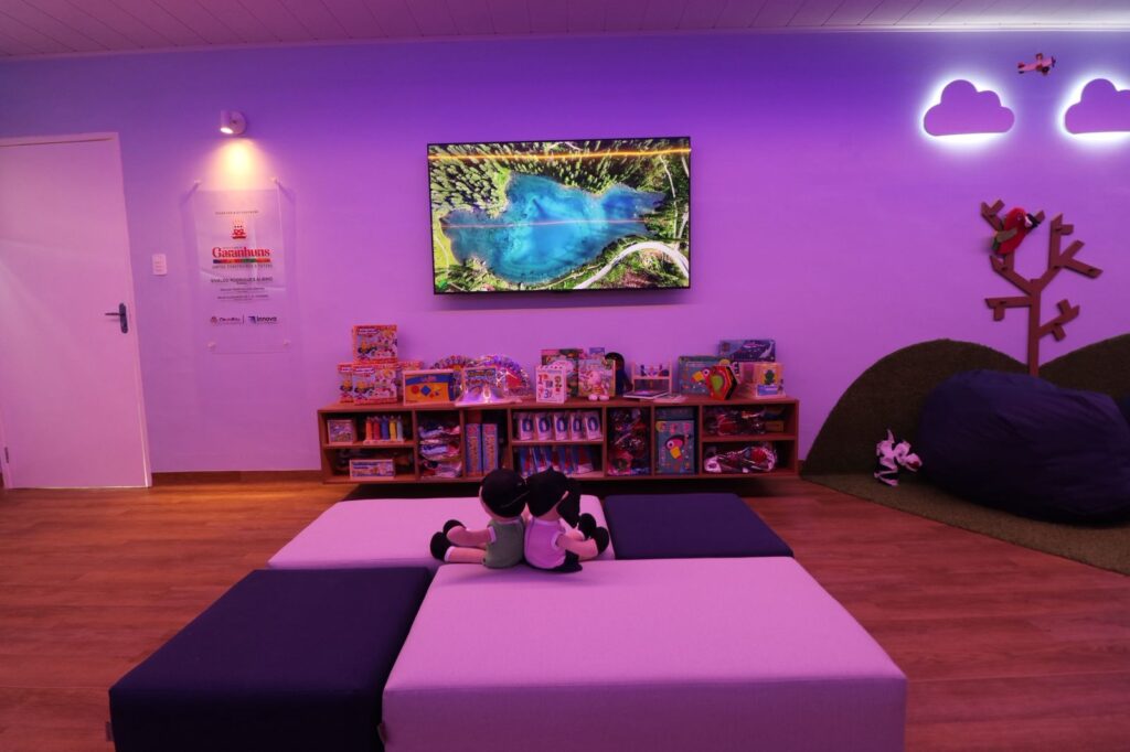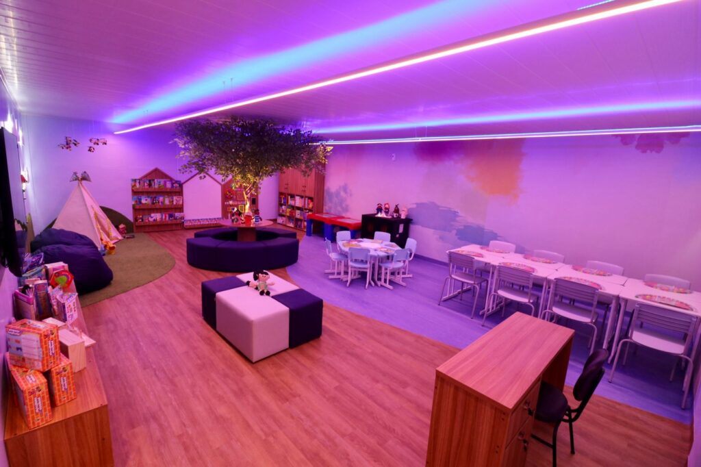 Toda a estrutura da sala é preparada para reduzir a sobrecarga sensorial e promover o bem-estar dos estudantes. O espaço conta com recursos pedagógicos, mobiliário adaptado e itens que trazem experiências que favorecem a concentração e o aprendizado.