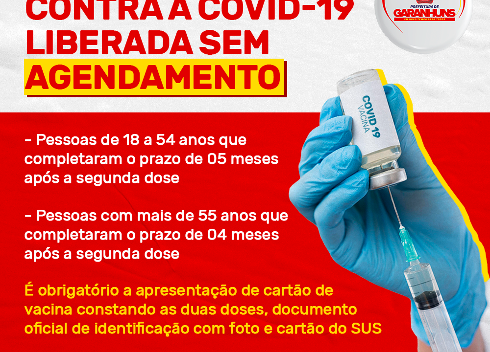 A partir desta sexta-feira (17), o município de Garanhuns passa a adotar o sistema de livre demanda para a vacinação de reforço contra a Covid-19. Com isso, as pessoas com mais de 18 anos, que estiverem dentro dos critérios estabelecidos, poderão ir diretamente aos pontos de vacinação, sem a necessidade de agendamento prévio pelo site Vem Vacina.