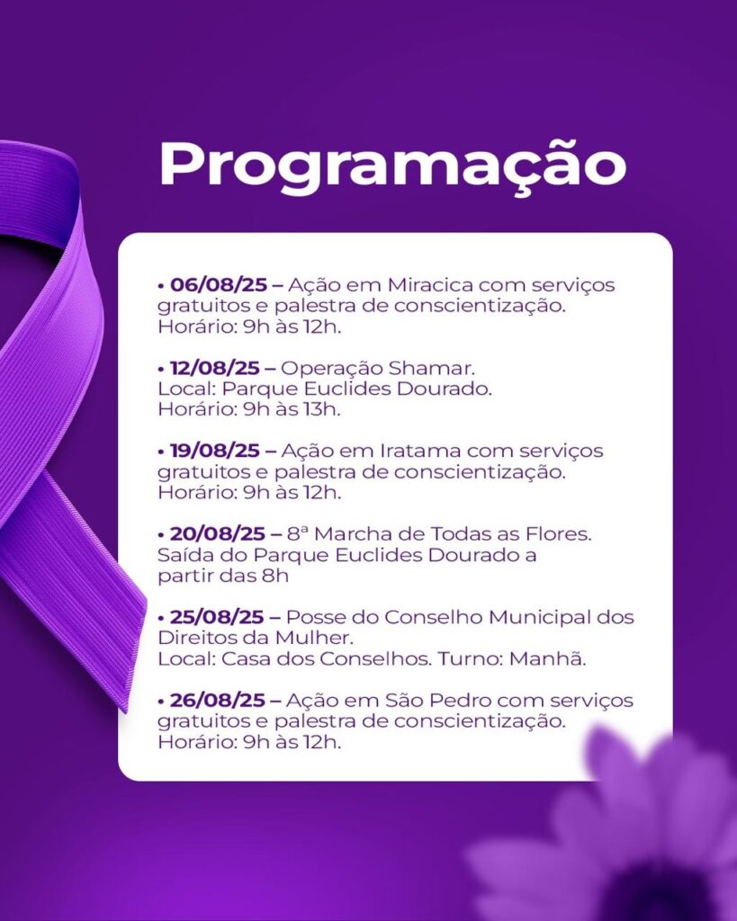 A programação inclui ainda a Operação Shamar 2025 que será realizada no dia 12 de agosto, das 9h às 13h, também no Parque Euclides Dourado. A iniciativa é do Departamento de Polícia da Mulher (DPMUL) da Polícia Civil, em parceria com diversas instituições e com a SecMulher. O objetivo é intensificar as ações educativas, preventivas e repressivas no enfrentamento à violência de gênero e na prevenção ao feminicídio.
