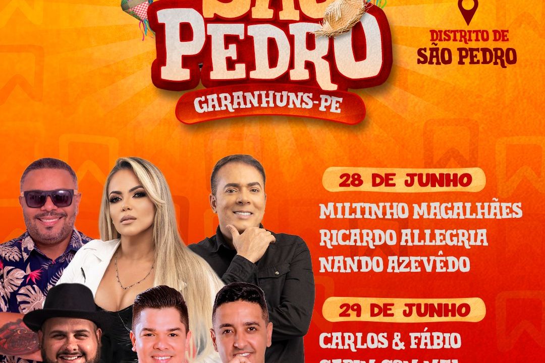 Com a realização da Prefeitura de Garanhuns, por meio da Secretaria de Cultura, acontece nos dias 28 e 29 de junho, mais uma edição da Festa de São Pedro. O evento ocorre no distrito de São Pedro, e vai contar com shows, celebrações religiosas e cavalgada em sua programação.