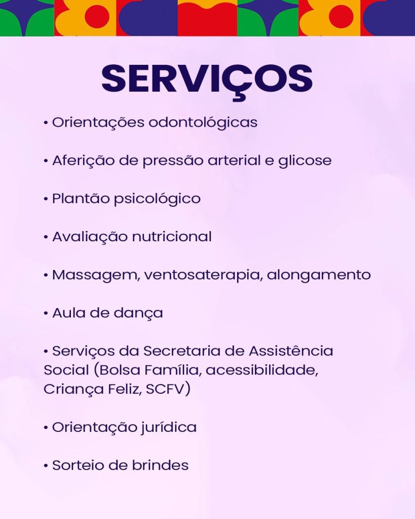Serão oferecidos diversos serviços gratuitos à população, incluindo orientações odontológicas, aferição de pressão arterial e glicose, atendimento psicológico, avaliação nutricional, massagem, ventosaterapia e alongamento, aula de dança, além de serviços da Secretaria de Assistência Social, orientações jurídicas e sorteio de brindes.