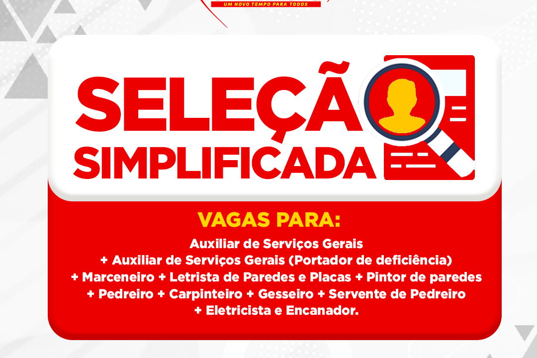 De início, serão disponibilizadas: 57 vagas para Auxiliar de Serviços Gerais; 04 vagas para Auxiliar de Serviços Gerais – PCD; 01 vaga para Marceneiro; 01 vaga para Letrista de Paredes e Placas; 01 vaga para pintor de paredes; 01 vaga para Pedreiro; 01 vaga para Carpinteiro; 01 vaga para Gesseiro; 01 vaga para Servente de Pedreiro; 01 vaga para Eletricista e 01 vaga para Encanador.