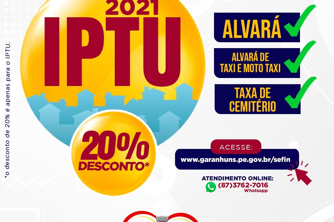 A prefeitura de Garanhuns, por meio da Secretaria de Finanças, promove campanha de incentivo aos contribuintes, visando a regularização de débitos com condições especiais, bem como, informa que já estão disponíveis os tributos para 2021, com descontos especiais na emissão de Taxas de Licença, IPTU, Taxa de Limpeza Urbana (TLP), Taxas de Cemitério, ISS, entre outros.