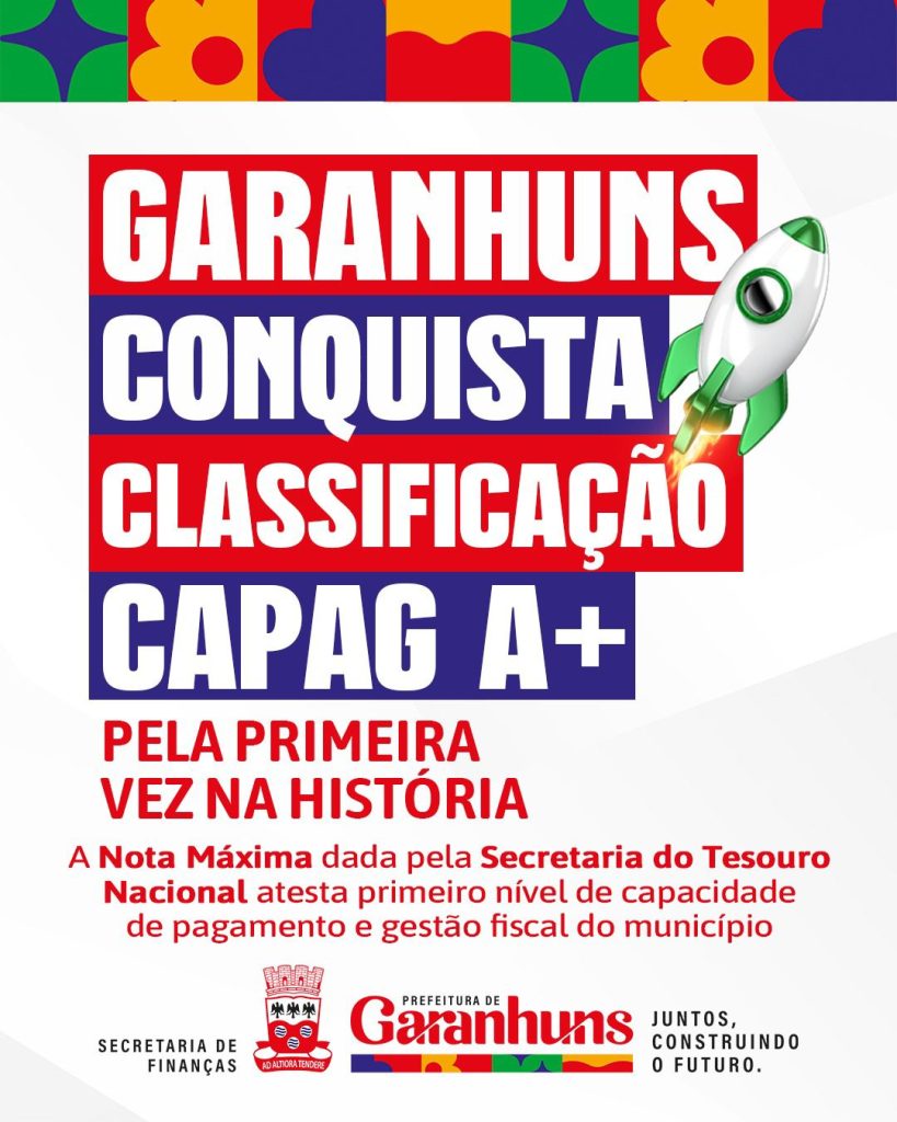 Boa notícia que atesta a gestão profissional da Prefeitura de Garanhuns. O município conquistou pela primeira vez a nota máxima na Capacidade de Pagamento (CAPAG), índice calculado pela Secretaria do Tesouro Nacional (STN). A avaliação subiu para a CAPAG A+, refletindo o compromisso da gestão municipal com a responsabilidade fiscal e a boa administração dos recursos públicos.