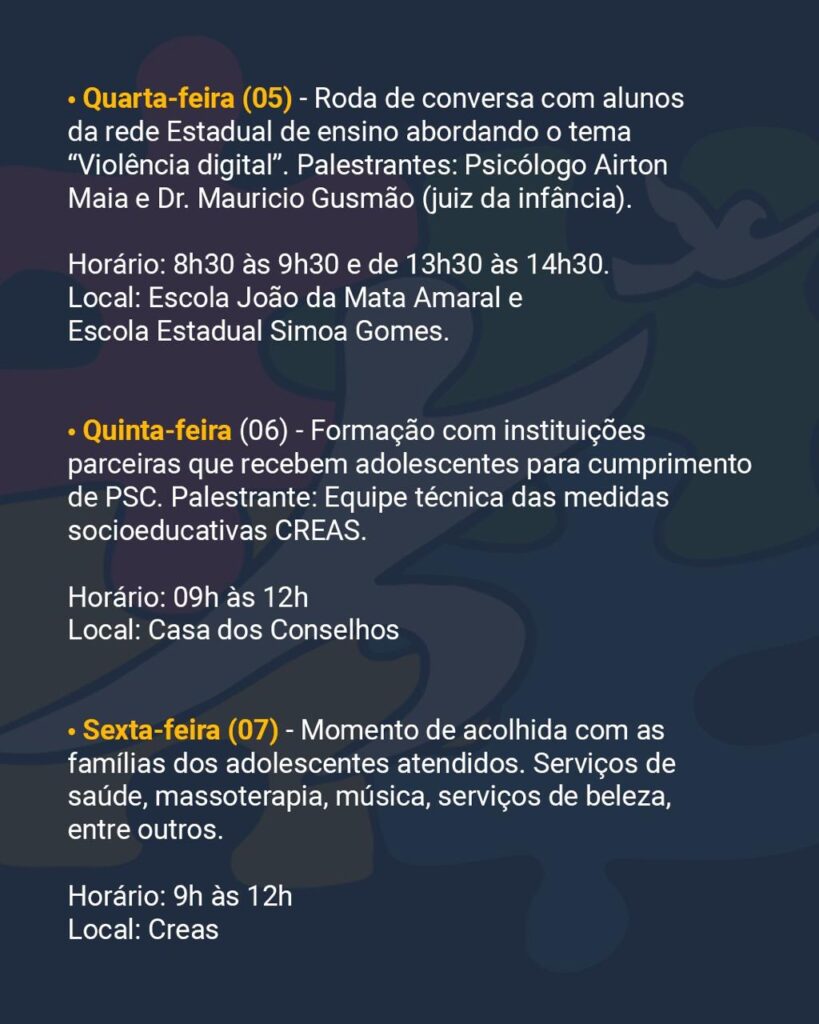 Com o objetivo de apresentar um balanço das ações desenvolvidas durante o ano e de discutir a temática da socioeducação, a iniciativa busca sensibilizar os participantes para a reflexão sobre o tema, destacando o diálogo e a importância da articulação entre os órgãos públicos na execução das medidas socioeducativas em meio aberto, sem privação de liberdade.