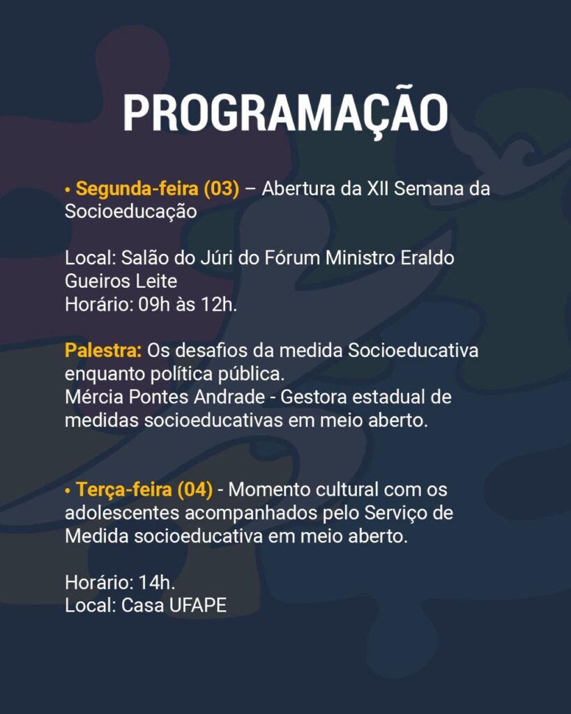 A abertura acontecerá na próxima segunda-feira (03) no salão do júri do Fórum Ministro Eraldo Gueiros Leite, das 9h às 12h, e contará com uma palestra sobre os desafios da medida socioeducativa enquanto política pública.